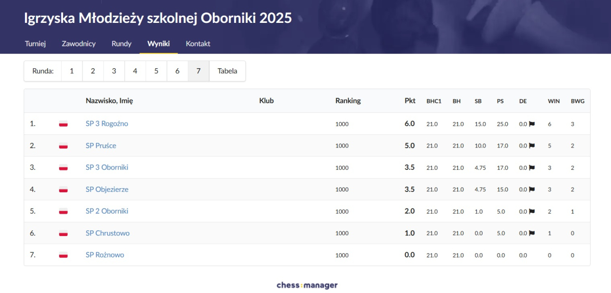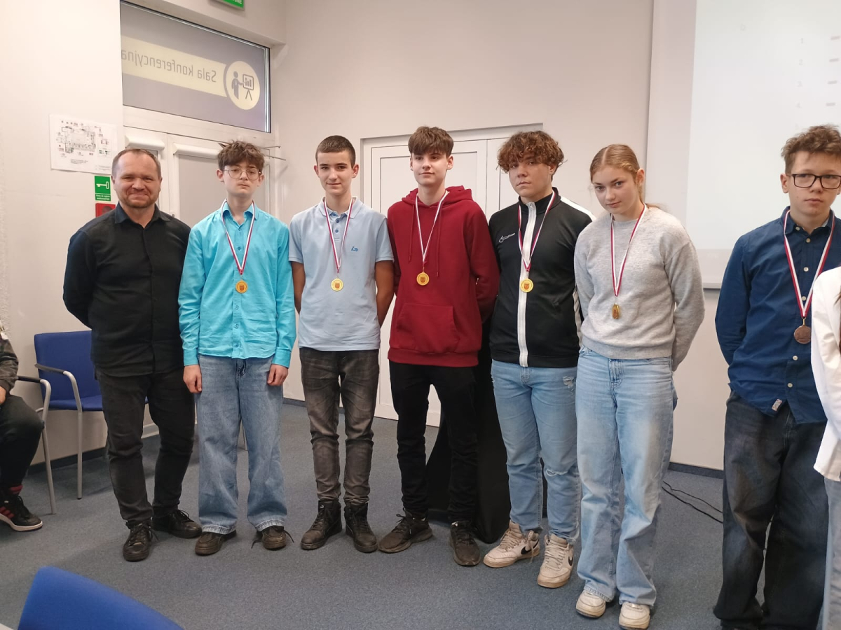 Dnia 13.11.2025 r. (Czwartek) pięcioro uczniów naszej szkoły z klas 7-8, reprezentowało naszą Szkołę podczas Igrzysk Młodzieży Szkolnej w Szachach. Turniej na szaczeblu powiatowym odbył się Obornikach w Centrum Rekreacyjnym. W Igrzyskach wzięło udział siedem szkół podstawowych naszego powiatu oraz cztery szkoły średnie, każda grając w swojej kategorii. Szkoły grały w systemie kołowym w czasie 15 min. na zawodnika. W taki sposób na szkoły podstawowe przypadło siedem rund z czego jedna runda podlegała pauzie ze względu na brak przeciwnika. Wielką radością napawa nas fakt, że uczniowie naszej szkoły zajeli pierwsze miejśce wygrywając wszystkie rundy, kwalifikując się tym samym do kolejnego etapu tym razem na szczeblu wojewódzkim.